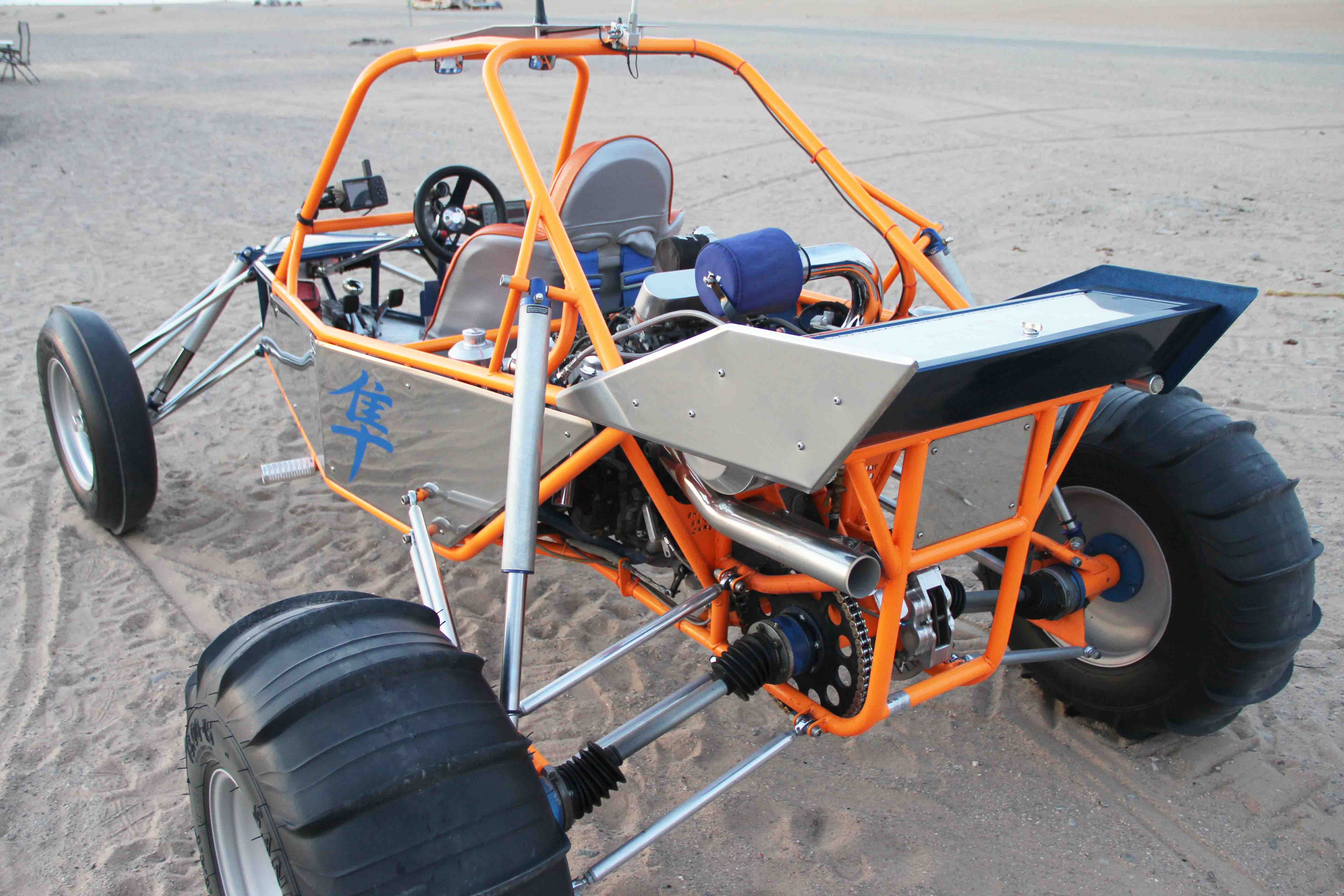 Dyno runs 2012 with 10 lb spring and mix 91 and Sunoco110 octane gasoline produced 238 hp at rear wheels. This car is very fast it will do 80 mph in 3rd gear. Does not have reverse. Chain drive, live axle. Single disc brake with foot and hand control. The sandrail has LED front, rear, and a whip light for legal running at night in Glamis. Has a 2015 dune registration.